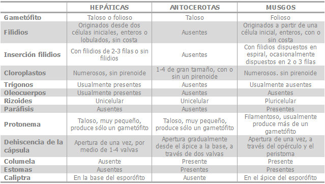 CUADRO COMPARATIVO HEPÁTICAS, ANTOCEROTAS Y MUSGOS